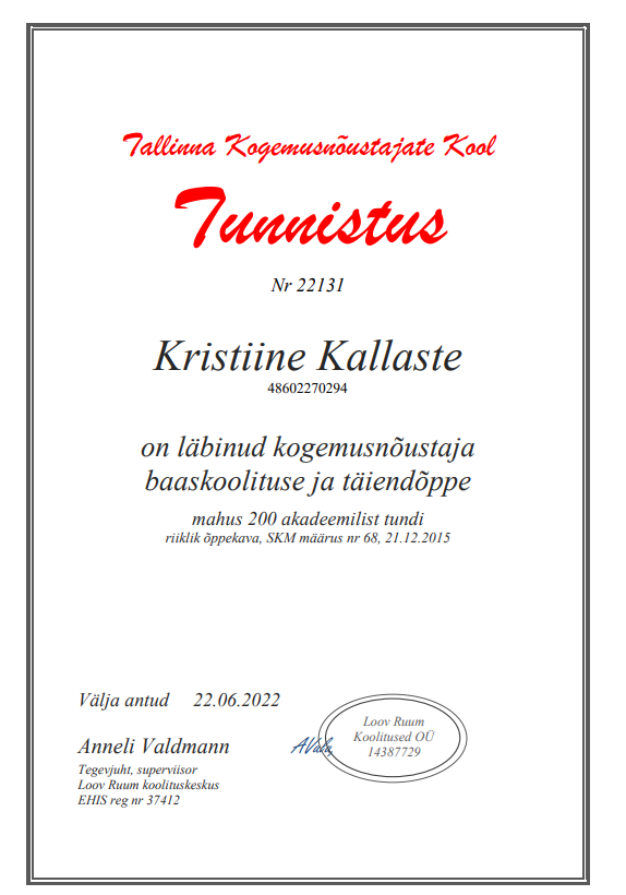 Kogemusnõustaja koolitus Loov Ruum koolitused OÜ (jaanuar- juuli 2022)