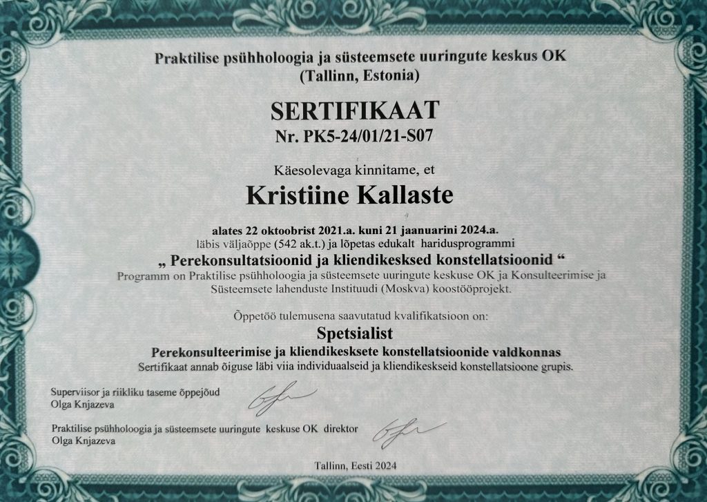 Süsteemne-fenomenoloogiline lähenemine ja perekondlikud paigutused ehk perekonstellatsioonid. Supervisioonitöö sooritatud detsembris 2023 a õpetaja Olga Knjazeva juhendamisel (oktoober 2021-jaanuar 2024)
